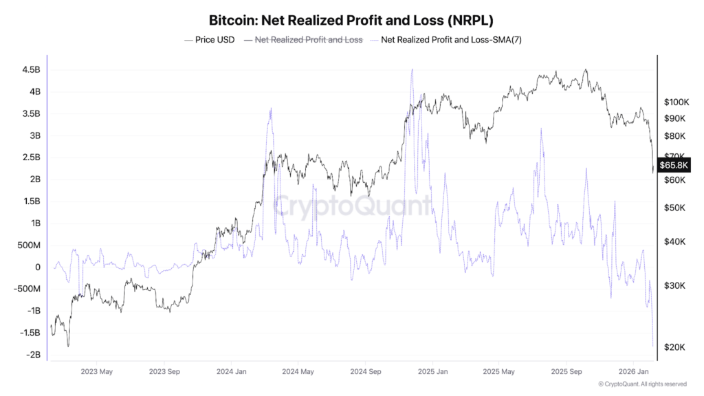 Another clear indication of capitulation can be seen through the Net Realized Profit and Loss (NRPL) chart. This measures the total profit or loss that investors lock in when coins move on-chain. Every Bitcoin has a recorded “last moved price,” often referred to as its cost basis. When a coin moves at a price higher than its cost basis, it is counted as realized profit; when it moves below that level, it is counted as realized loss.