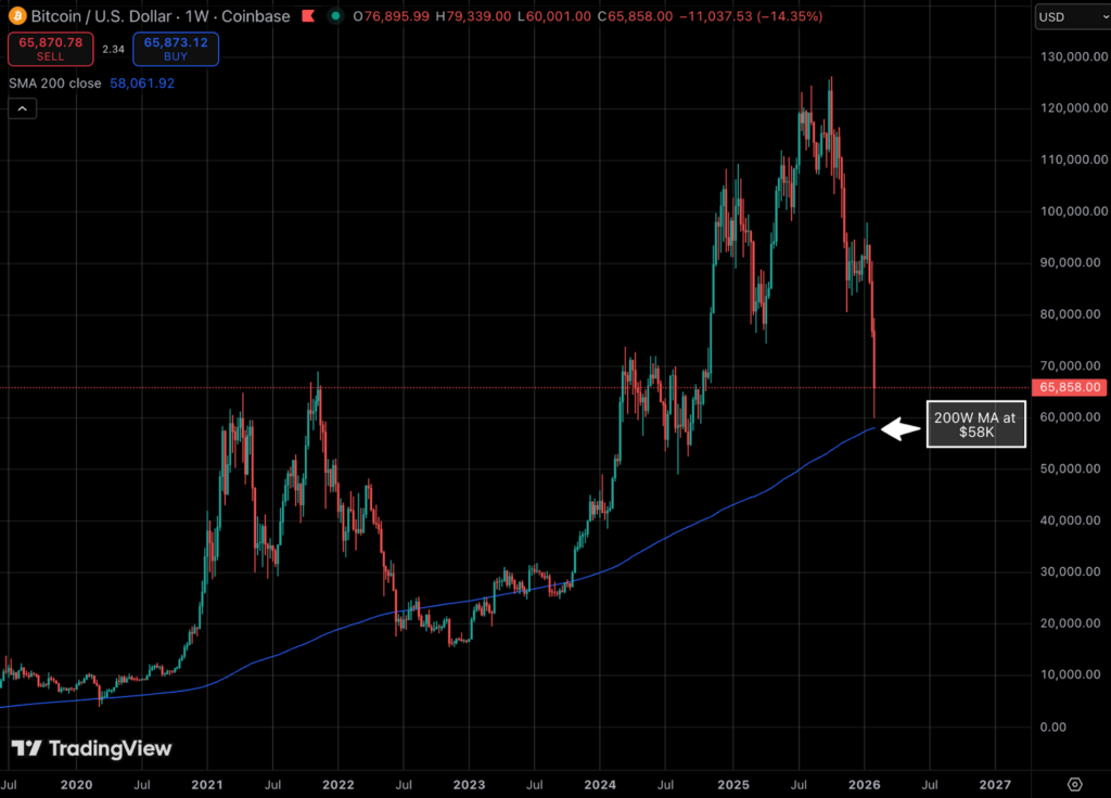 In terms of technical indicators that can act as a support area, the 200 week moving average is the one to keep close tabs on. This currently sits at $58K and represents an important zone that has marked major bottoms in previous Bitcoin cycles.