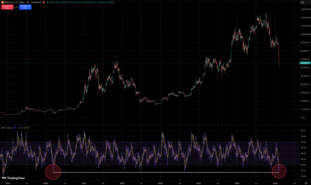 The fact is Bitcoin has now entered oversold territories not seen since previous bear market lows and some even indicating deeper extremes. For example, the daily RSI has not been as low as it is since the COVID crash almost six years ago. This could suggest that selling may be stretched in the short term and traders are watching for signs of a relief bounce or momentum change.