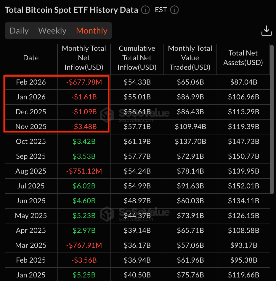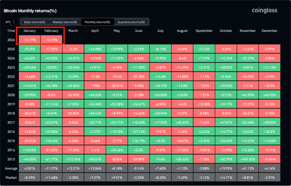 The modern market structure with institutional adoptions add another new layer to this dynamic. With the arrival of spot Bitcoin ETFs in January 2024, early-year performance has increasingly been influenced by institutional allocation cycles. Q1 of 2024 saw approximately $12.13 billion in net inflows, followed by $922.09 million in Q1 2025. This year, however, the trend has sharply reversed. The market has already recorded roughly $2.28 billion in net outflows this quarter, coming after significant withdrawals in November and December. This shift in ETF flow dynamics represents a major departure from the supportive early-year demand that helped underpin prior February strength.