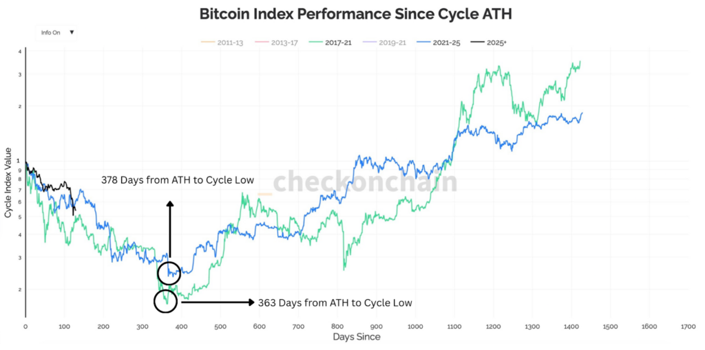 When we look at the prior two cycles, it took Bitcoin approximately 1060 days to hit a new all time high from cycle lows. In the latest cycle, this was 1050 days, showing a strong alignment playing out. Now if we invert this and examine the time from cycle highs to lows, the last two cycles reached a bottom almost around 370 days from previous all time highs. If we were to extrapolate that data, that would point to a potential bottom in October of this year.