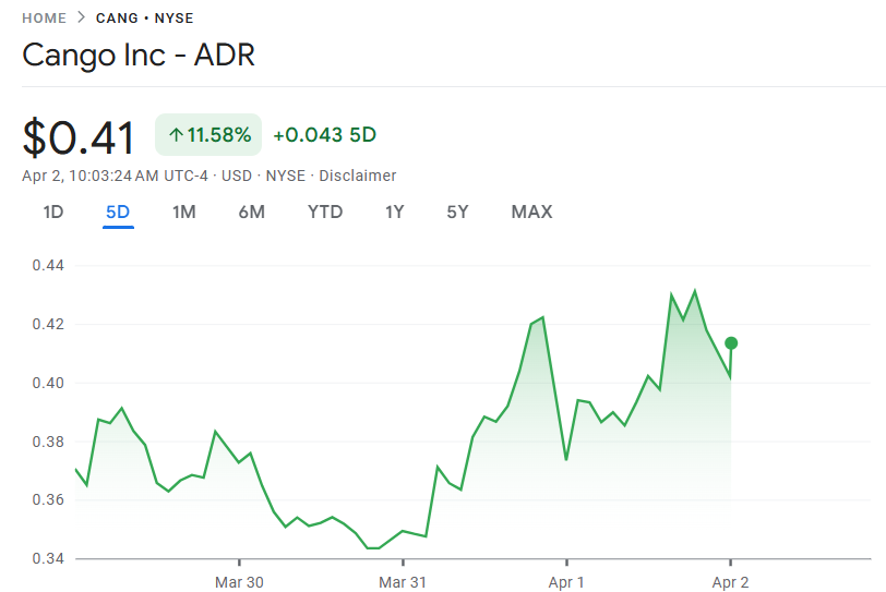 Cango’s CANG stock is up more than 11.5% over the last five days per Google Finance data, trading at $0.41 as of writing time.