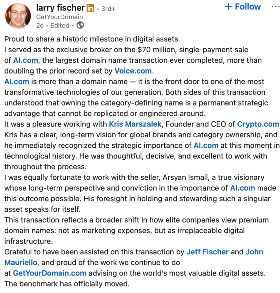 The price tag. This is the main reason why the purchase of AI.com stands out. At $70 million, the deal is now widely acknowledged as the largest publicly disclosed domain sale in history, going past previous headline-grabbing names like Voice.com, CarInsuranc.com and Chat.com. The purchase and Super Bowl launch was announced on X by Marszalek on February 6 stating that had been purchased in April last year and a team was being built since. The $70 million price tag was then confirmed by broker, Larry Fischer, in a LinkedIn post.
