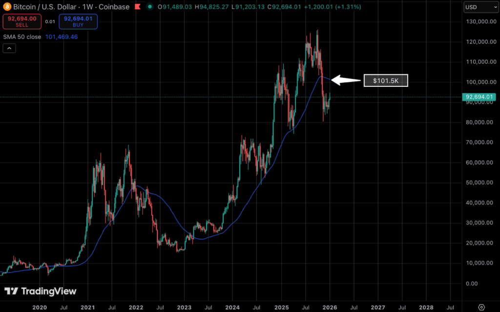 If this range can be tested and held, the next hurdle is the $100K psychological level. Followed by this, there is a key technical level in the 50 week simple moving average which has historically acted as a bull market band. This level currently sits at $101.5K.