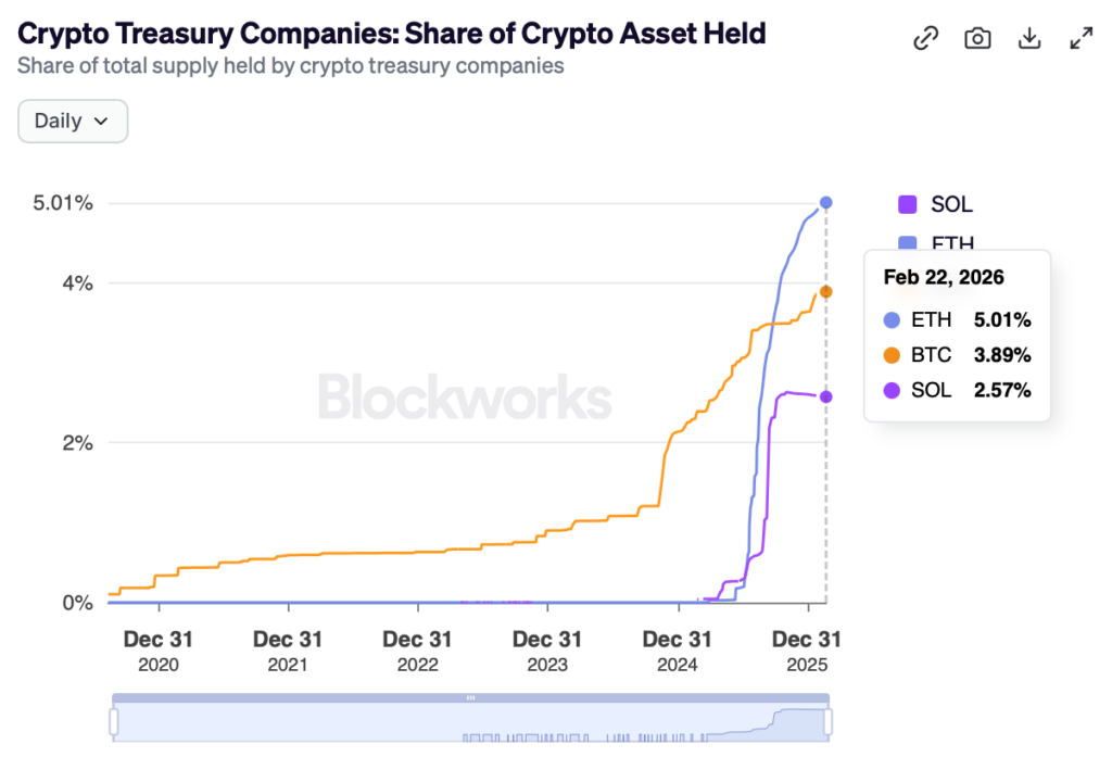 We can see this big shift by looking at the speed at which these companies have absorbed the supply of these assets. At the time of writing, public companies hold 2.57% of Solana’s total supply and Ethereum at over 5%. A reality that simply did not exist even if you look back just a year ago. Beyond these two networks, there are companies also accumulating other large cap layer 1 networks such as BNB, HYPE and SUI.