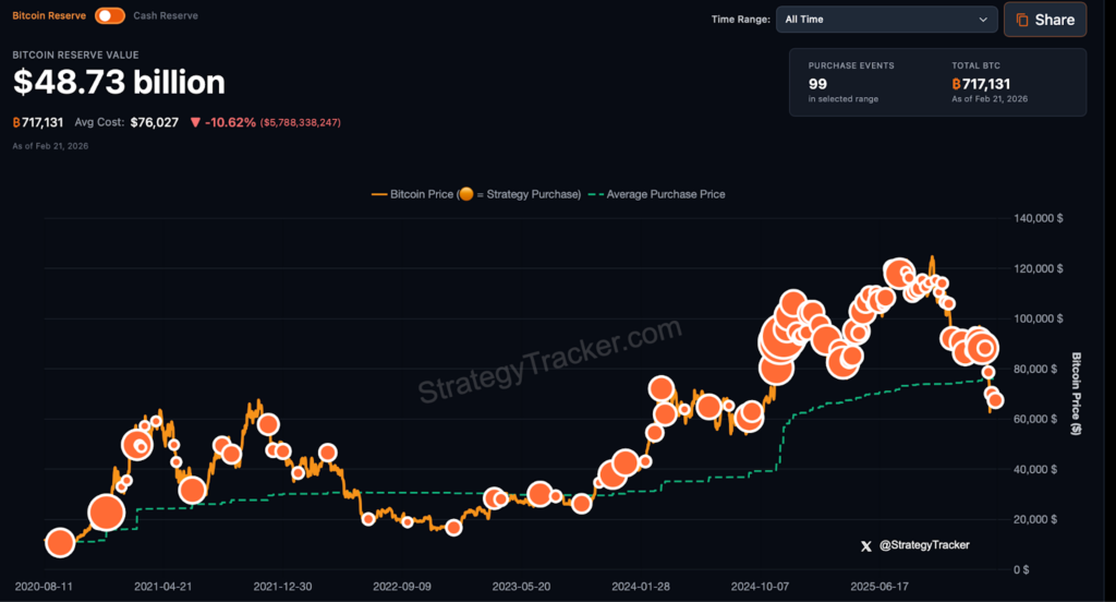 The first public company crypto treasury move came in August 2020 when Strategy (then Microstrategy) publicly disclosed a $250 million purchase of BTC (about 21,454 BTC at the time). Fast forward to February 2026, Strategy is now by far the largest DAT holding 717,131 BTC or 3.41% of Bitcoin’s total supply across 99 separate buy orders.